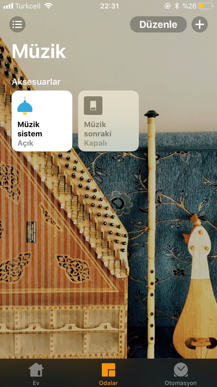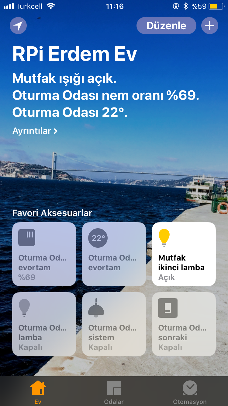 Raspberry Pi'ye Homebridge eklentisi kurularak herhangi bir HomeKit aksesuarı kullanmadan, telefondaki varsayılan EV uygulaması (iOS Home App) ile iki farklı odanın ışıkları aksesuar olarak tanımlanmış ve bunların kontrolü sağlanmıştır. EV uygulamasının doğrudan kontrolü haricinde komutların Siri üzerinden de aktarılması ile evdeki cihazların sesli olarak da kontrol edilmesi sağlandı. Ev ağından bağımsız olarak farklı bir alanda blulunan aydınlatma sisteminin de NodeMCU ve MQTT protkolü ile aynı uygulamadan kontrolü sağlandı. Python PyGame kütüphanesi ile basit bir MP3 çalar uygulaması yazılıp, Raspberry'nin kulaklık çıkışına mini bir hoparlör takılarak MP3 çalar kontrolünün (parça başlatma, duraklatma, ses ayarlama komutları) Home App ve Siri üzerinden yapılması sağlandı. iOS'un EV uygulamasında şu an için hoparlör aksesuar desteği bulunmadığından MP3 çalar 'sistem' adında bir lamba aksesuarı olarak tanımlanmıştır. Bu aksesuar için, lamba açma/kapama işlemi müzik durdurma/başlatma olarak ve lambanın parlaklık değeri de müzik çaların ses seviyesini değiştirecek şekilde Raspberry Pi tarafındaki python kodunda düzenleme yapılmıştır.