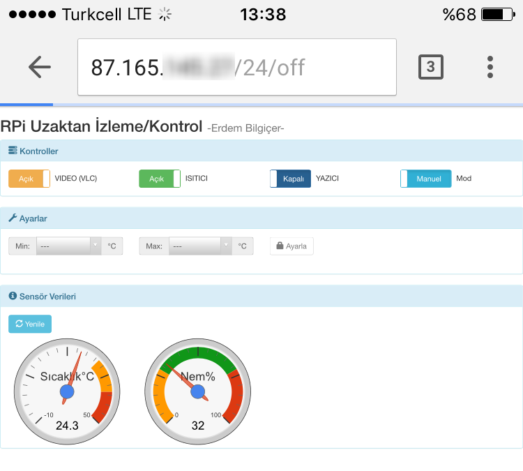 Evde bulunan, bazı sıcaklık değerlerinin altında ya da üstünde sorun çıkaran bir 3D yazıcının web üzerinden çalışmaya başlayacağı ve duracağı limit sıcaklıkların belirlenerek yazıcının sadece bu limit değerlerinde çalışması, uzaktan izlenebilmesi ve ortamda bulunan bir ısıtıcının uzaktan açılıp kapatılabilmesi sağlanmıştır. Raspberry Pi'ye Flask mini framework ile bir webserver kurulmuş, her açılışta IP adresini mail atmasını sağlayacak bir script yazılmış ve bağlı olduğu modeme port yönlendirmesi de yapılarak cihaza dünyanın herhangi bir yerinden erişim sağlanmıştır. DHT11 sıcaklık sensörü ile ortamın sıcaklık değerleri okunarak kullanıcının belirlediği eşik değerlere göre kıyaslama yapılarak yazıcı çalışmaktadır. Yine web üzerinden Picamera ve VLC Player ile ortam uzaktan izlenebilmektedir.